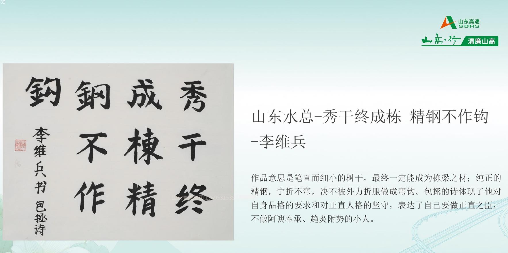 6月11日,在山东高速集团纪委组织的“清廉山高”廉洁文化作品征集活动中,山东水总基础工程有限公司制作的短视频《筑廉洁防线,守初心之路》荣获“光影映廉”板块三等奖,第二分公司李维兵的书法作品《秀干终成栋,精钢不作钩》摘得“工艺创廉”书法类优秀奖。