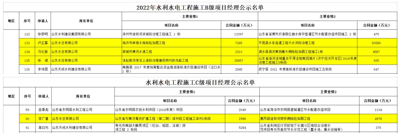 近日,中国水利企业协会发布《2022年开云集团官网-开云(中国) 施工项目经理评价等级公示》,我公司卢正雷、马化振、张斌三名同志被评为“2022年开云集团官网-开云(中国) 施工B级项目经理”,李广喜被评为“2022年开云集团官网-开云(中国) 施工C级项目经理”。