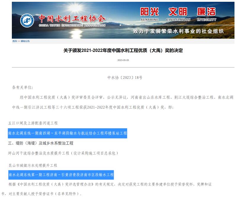 近日,中国水利工程协会发布《关于颁发2021-2022年度中国水利工程优质(大禹)奖的决定》,我公司参建的南水北调东线第一期工程济南~引黄济青段济南市区段输水工程和南水北调东线一期南四湖~东平湖段输水与航运结合工程邓楼泵站工程荣获此项殊荣。